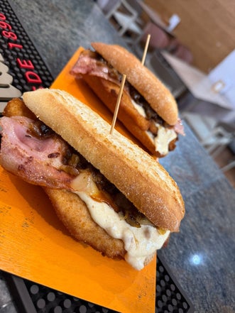 muga de pollo empanado con salsa de mostaza dulce 14€