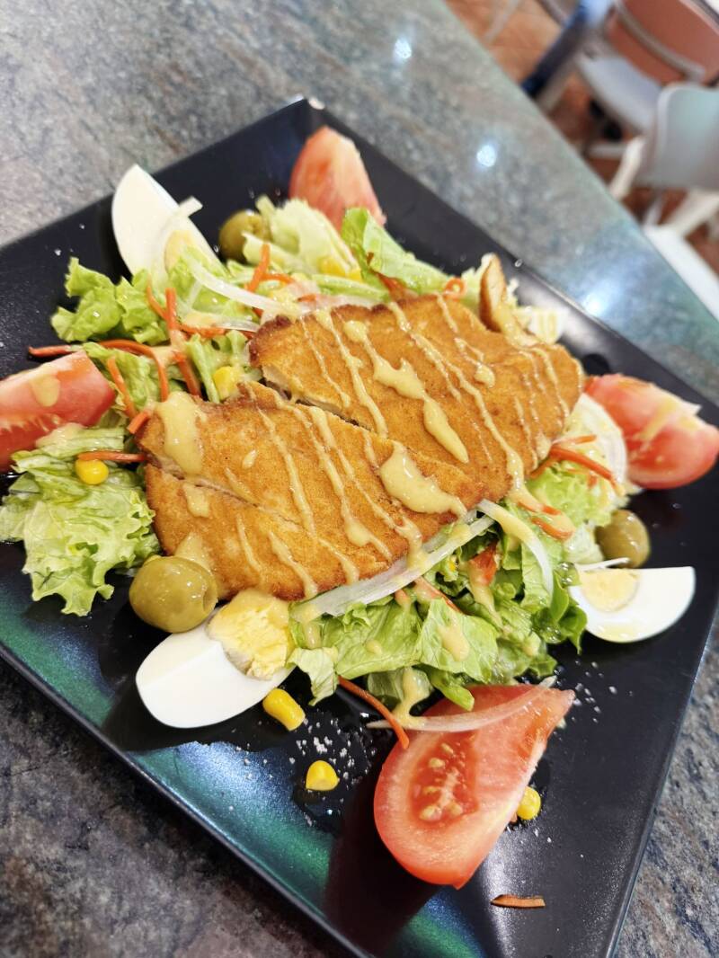 muga de pollo empanado con salsa de mostaza dulce 14€